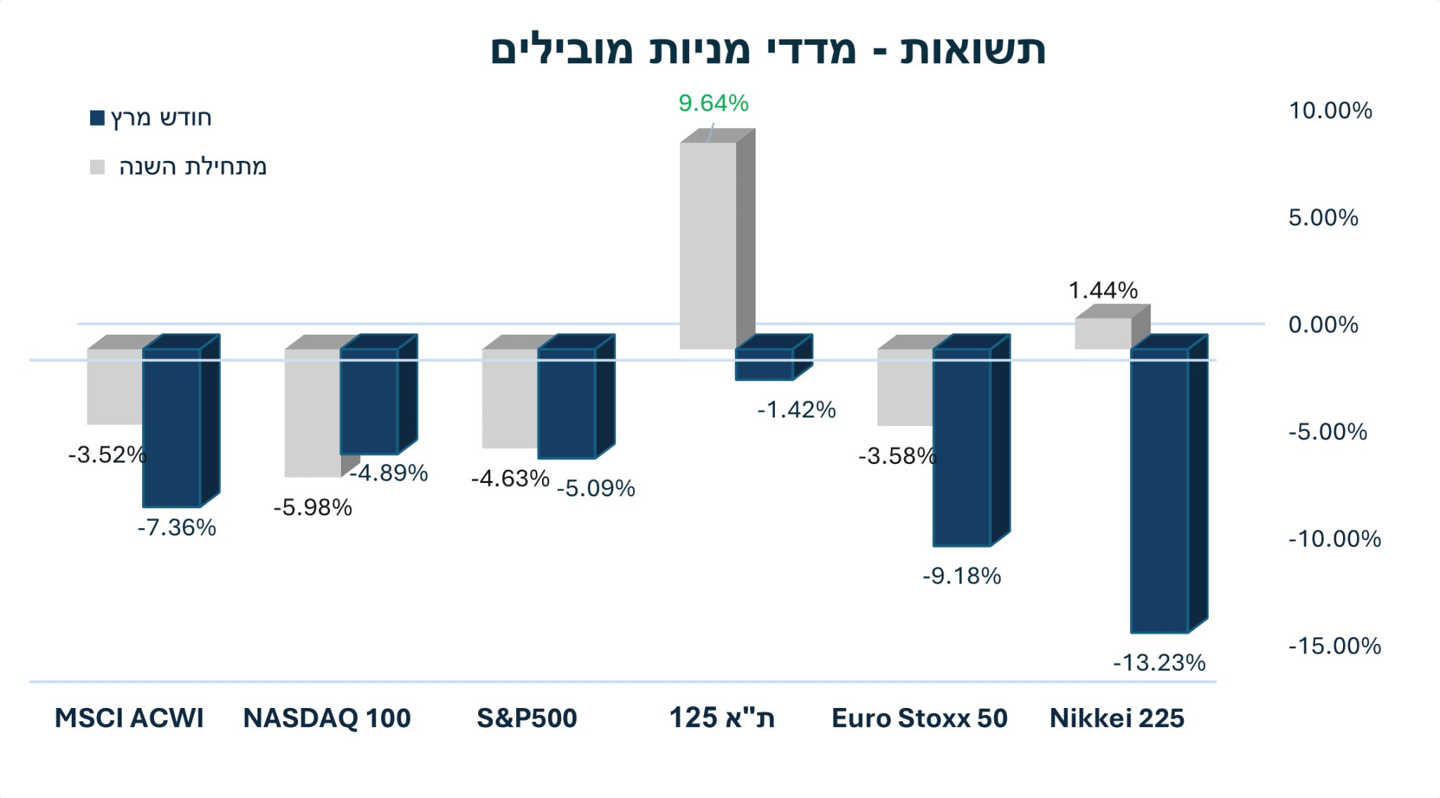 חודש מרץ התאפיין בתנודתיות גבוהה בשווקים, על רקע מבצע "שאגת הארי" והשפעתו על הסביבה הפיננסית בארץ ובעולם. בתחילת החודש נרשמה אופטימיות בשווקים, אך בהמשך, עם התמשכות הלחימה, עלו מחירי הנפט והובילו לעלייה בציפיות האינפלציה ולירידה בציפיות להפחתות ריבית מצד הבנקים המרכזיים.