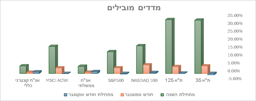 אינפלציה וריבית – בספטמבר נרשמה ירידה של 0.6% במדד המחירים לצרכן, שהורידה את האינפלציה השנתית ל-2.5% גם בשוק הדיור נרשמה ירידה חודשית של 0.6% במחירים, בעיקר בתל אביב והמרכז, והקצב השנתי התמתן ל-0.7%. הירידה באינפלציה תומכת בציפיות להורדת ריבית בהחלטת בנק ישראל הבאה, וזאת לאחר שגם בחודש ספטמבר האחרון הותיר בנק ישראל את הריבית ללא שינוי ברמה של 4.5%.