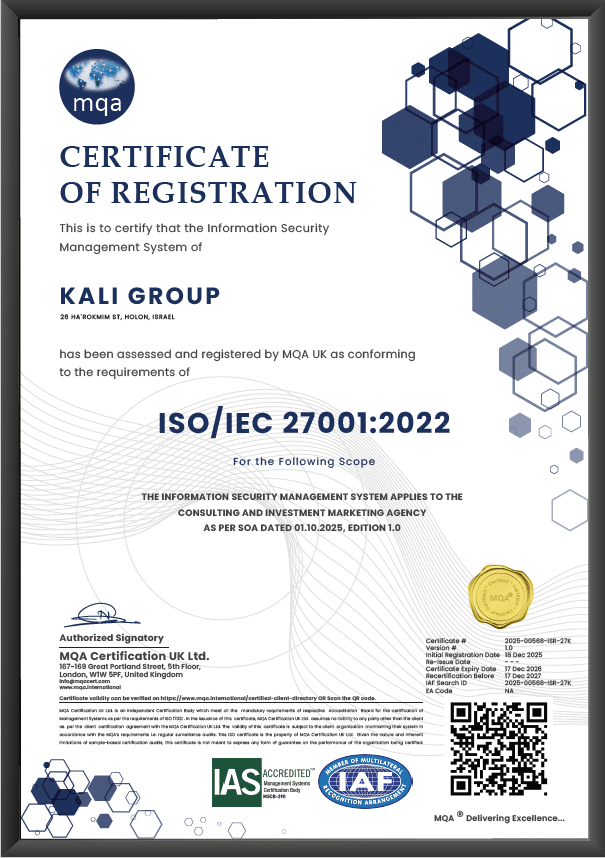 ISO 27001 – This year, Kali Group has successfully completed its qualification for the ISO27001 international security standard. The security standard is implemented on the company’s management systems. The standard was adopted out of a commitment to protect the privacy of our customers’ information.